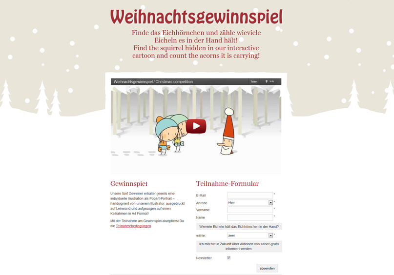 21.12.2012 | Wir haben dieses Jahr wieder ein liebevoll gestaltetes Gewinnspiel vorbereitet. In unserem Weihnachtstrickfilm ist ein Eichhörnchen versteckt – finden Sie es und zählen Sie wie viele Eicheln es in der Hand hält! Unsere fünf Gewinner erhalten jeweils eine individuelle Illustration als Popart-Portrait – handsigniert von unserem Illustrator, ausgedruckt auf Leinwand und aufgezogen auf einen Keilrahmen ... weiterlesen